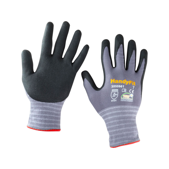 HandyFit S/7 er laget av spandex nylon med skumnitril på håndflatene og fingertuppene. Hanskene er laget med følgende beskyttelsesnivå: slitestyrke 4 (antall omdreininger), kuttmotstand 1 (indeks), rivemotstand 3 (Newton), punkteringsmotstand 1 (Newton) og kuttmotstand EN ISO 13997 (N). De har høy motstand mot slitasje samt sklisikre håndflater for bedre komfort under bruk. Det gir en virkelig god passform og høy fleksibilitet – du må bare huske å velge riktig størrelse for hånden din (størrelsene er EU-standard). Øko-tex standard 100 betyr at arbeidshanskene er laget av miljøvennlige og ikke skadelige materialer.