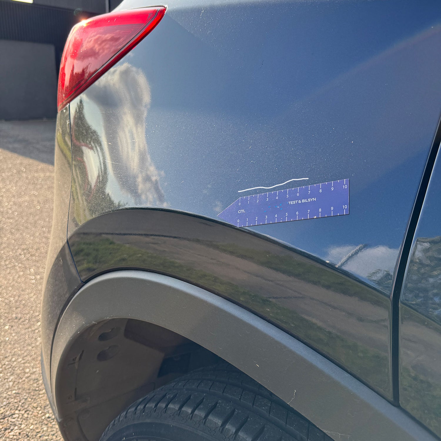 Smart til å måle skader på biler. Merk at den ikke fester seg til deler av aluminium eller plast. Linjalene trykkes på fleksibel magnetfolie - noe som gjør dem enkle å flytte og gir god feste. Det betyr at linjalen sitter godt selv på kurvede bilkarosserier (se bilde).