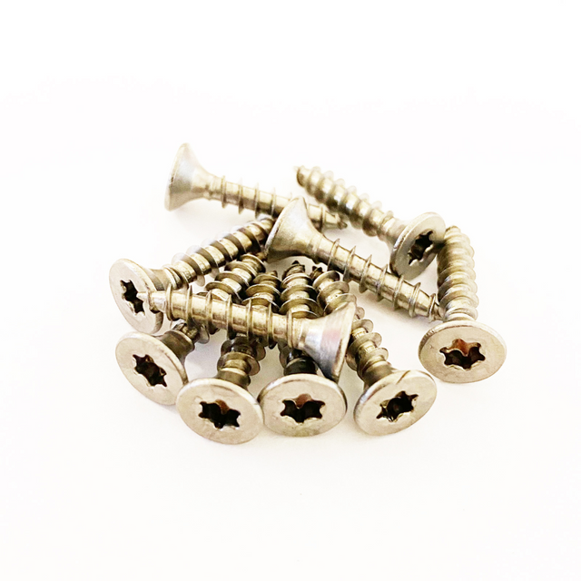 Pakke med 10 stk. små sponplateskruer 4 mm. med innfelt hode og torx-hakk.