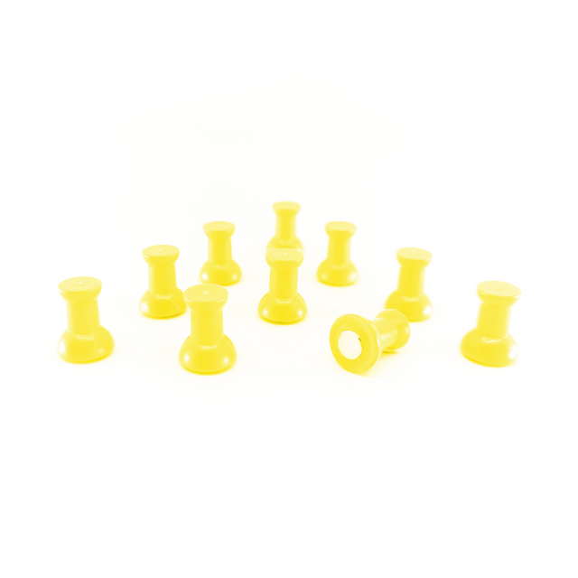 Pakke med 10 små magneter som ser ut som gule tegnestifter.